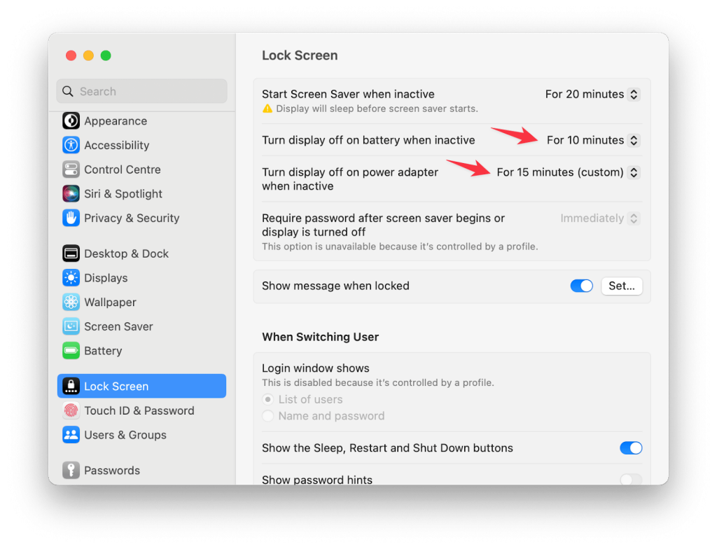 - Set “When I close the lid” to “Do nothing” for both battery and plugged in.