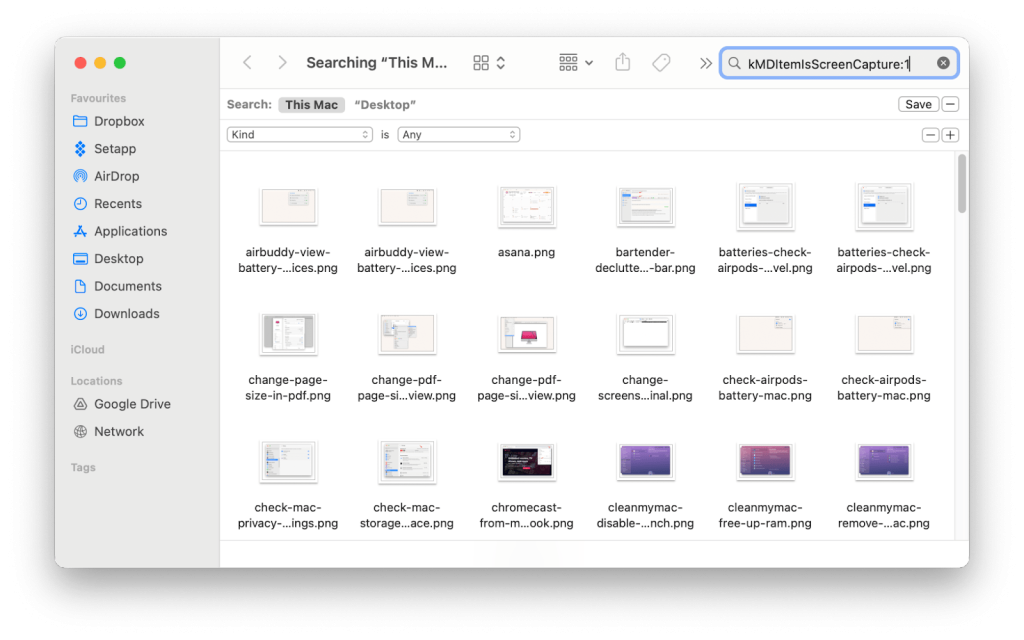 - Finder search: Use keywords like “Screen Shot”