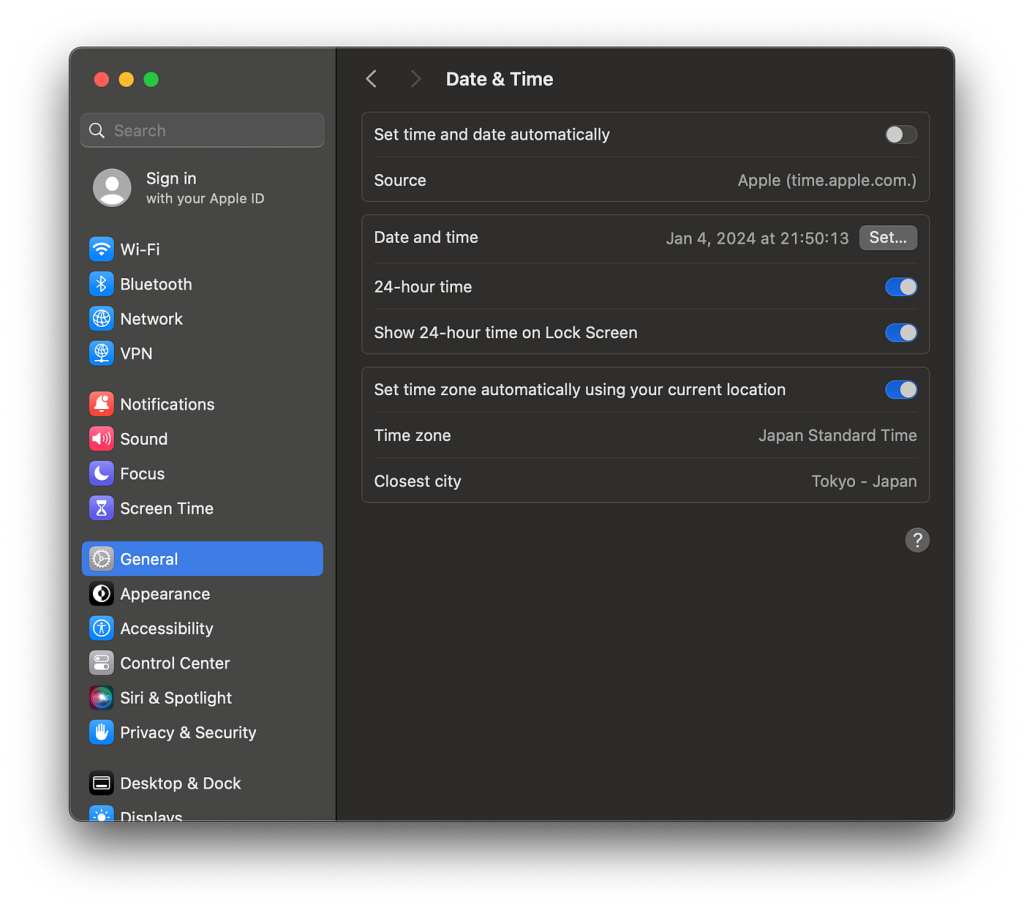 Automatic date and time disabledcan lead to errors. Macs usually sync time with Apple servers. If this feature is off, the time will not update correctly.